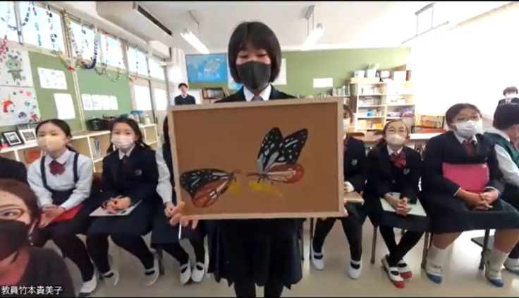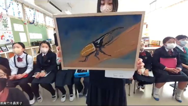 Then Class 6 students continued sharing information about their favorite animated character and some projects they had made in their painting class in the school. Many students showed paintings they made related to butterflies and beetles.
